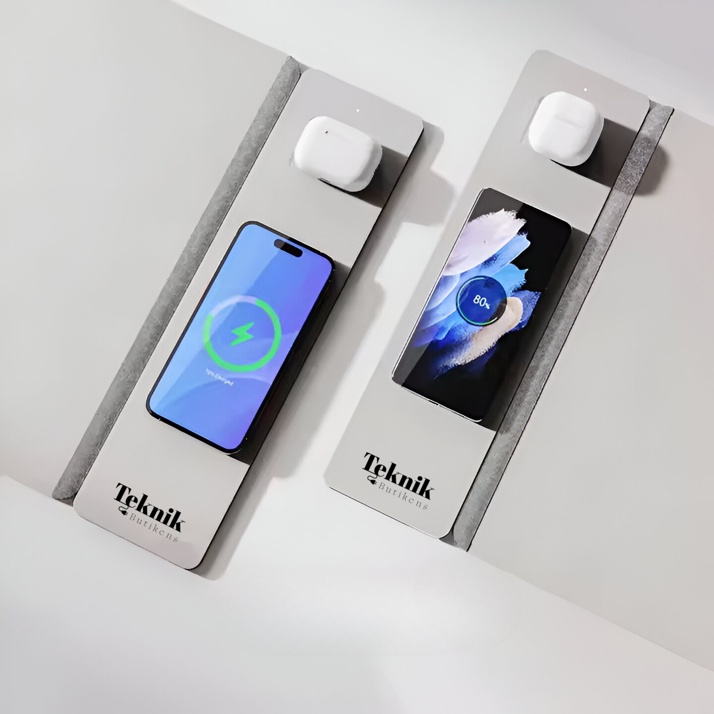 - Snabb trådlös laddning för telefon och trådlösa hörlurar som fästs magnetiskt.